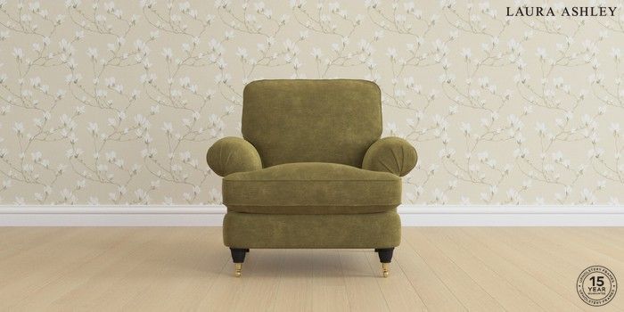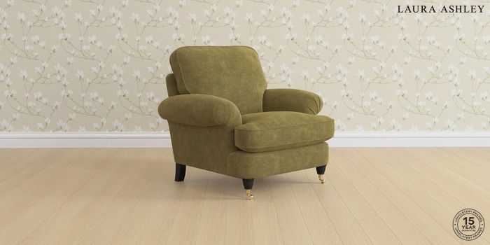 6.12.1 Buy Beaumaris by Laura Ashley Armchair Alwyn Velvet Olive Green Low Brass Castor - Black from the Laura Ashley online shop Click here to use our website with more accessibility support, for example screen readers