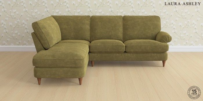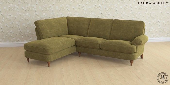 6.12.13 Buy Beaumaris by Laura Ashley Medium Sofa Chaise - Left Hand Alwyn Velvet Olive Green Low Turned - Teak from the Laura Ashley online shop Click here to use our website with more accessibility support, for example screen readers