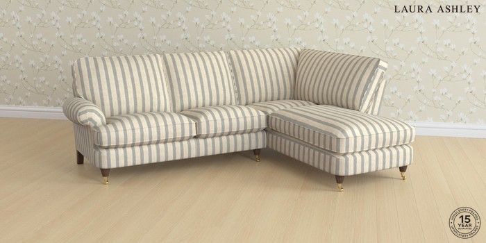 6.12.1 Buy Beaumaris by Laura Ashley Medium Sofa Chaise - Right Hand Kinsham Stripe Seaspray Blue Low Brass Castor - Chestnut from the Laura Ashley online shop Click here to use our website with more accessibility support, for example screen readers