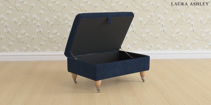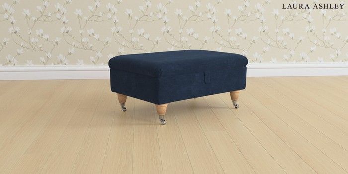 6.12.13 Buy Beaumaris by Laura Ashley Storage Footstool Alwyn Velvet Midnight Navy Low Chrome Castor - Light Oak from the Laura Ashley online shop Click here to use our website with more accessibility support, for example screen readers