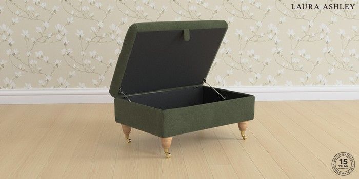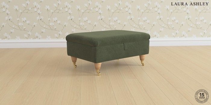 6.12.1 Buy Beaumaris by Laura Ashley Storage Footstool Lundar Chenille Ivy Green Low Brass Castor - Light Oak from the Laura Ashley online shop Click here to use our website with more accessibility support, for example screen readers