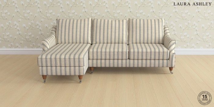 6.12.1 Buy Beverley by Laura Ashley Medium Sofa Chaise - Left Hand Kinsham Stripe Seaspray Blue Low Chrome Castor - Teak from the Laura Ashley online shop Click here to use our website with more accessibility support, for example screen readers