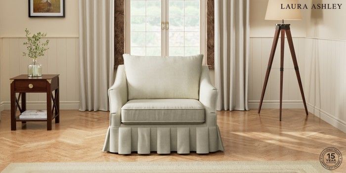 Sit back and relax in style with the elegant Laura Ashley Beverley sofa - featuring a relaxed box pleat at the base to create a beautiful modern country look. From its flared set back sofa arm design to the pillow edged back cushions smart valance to the floor, the Beverley sofa makes an excellent addition to any living space. Foam seat cushions with soft foam toppers offer comfort, support, and ease of maintenance. Pair this with the box pleat footstool to complete the look!