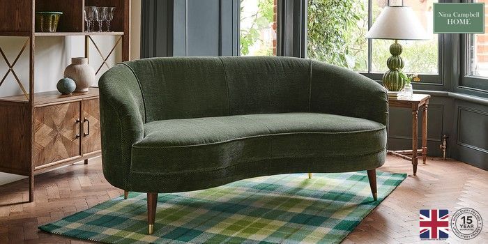 Bramerton by Nina Campbell is an elegant curved shaped sofa, perfect for interior enthusiasts. Designed with a serpentine sprung seat and superloop sprung back to provide excellent support and longevity, the multi layered foam fixed seat and back construction wraps for supreme comfort. With a matching footstool that seamlessly nestles into the curve of the sofa to create a chaise when desired. The tapered show wood legs with brass slipper cups add detail and sophistication for the finishing touches. Requires minimal assembly for feet.