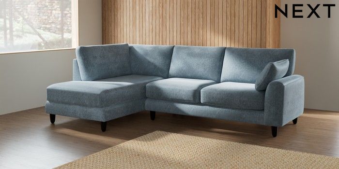 7.2.6 Buy Campbell Medium Corner Chaise - Left Hand Plush Chenille Light Blue High Leg - Dark from the Laura Ashley online shop Click here to use our website with more accessibility support, for example screen readers