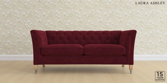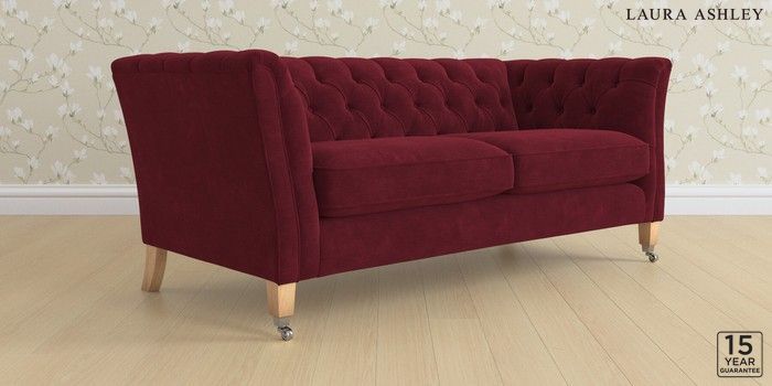 6.12.1 Buy Chatsworth Button Back by Laura Ashley 3 Seater Small Sofa Alwyn Velvet Burgundy Red Straight Chrome Castor - Light Oak from the Laura Ashley online shop Click here to use our website with more accessibility support, for example screen readers