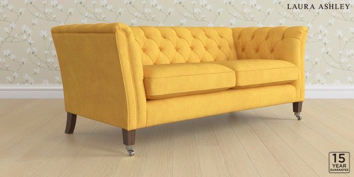 6.12.1 Buy Chatsworth Button Back by Laura Ashley 3 Seater Small Sofa Bainton Ochre Yellow Straight Chrome Castor - Chestnut from the Laura Ashley online shop Click here to use our website with more accessibility support, for example screen readers