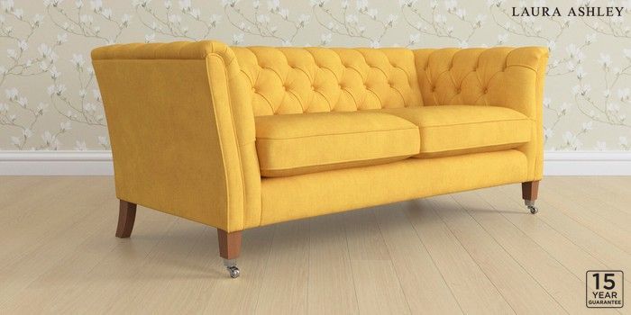 6.12.1 Buy Chatsworth Button Back by Laura Ashley 3 Seater Small Sofa Bainton Ochre Yellow Straight Chrome Castor - Teak from the Laura Ashley online shop Click here to use our website with more accessibility support, for example screen readers