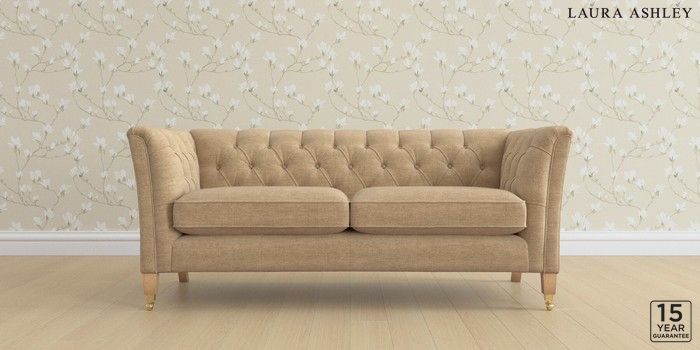 6.12.1 Buy Chatsworth Button Back by Laura Ashley 3 Seater Small Sofa Edwin Chenille Gold Natural Straight Brass Castor - Light Oak from the Laura Ashley online shop Click here to use our website with more accessibility support, for example screen readers