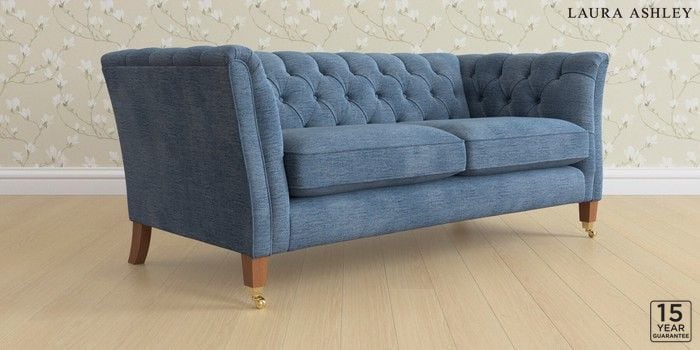 6.12.1 Buy Chatsworth Button Back by Laura Ashley 3 Seater Small Sofa Edwin Chenille Seaspray Blue Straight Brass Castor - Teak from the Laura Ashley online shop Click here to use our website with more accessibility support, for example screen readers