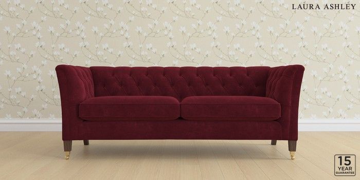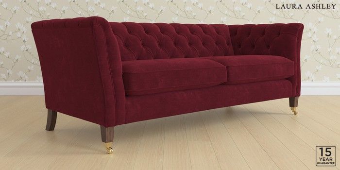 6.12.1 Buy Chatsworth Button Back by Laura Ashley 3 Seater Sofa Alwyn Velvet Burgundy Red Straight Brass Castor - Chestnut from the Laura Ashley online shop Click here to use our website with more accessibility support, for example screen readers