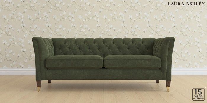 6.12.13 Buy Chatsworth Button Back by Laura Ashley 3 Seater Sofa Alwyn Velvet Ivy Green Straight Brass Castor - Chestnut from the Laura Ashley online shop Click here to use our website with more accessibility support, for example screen readers