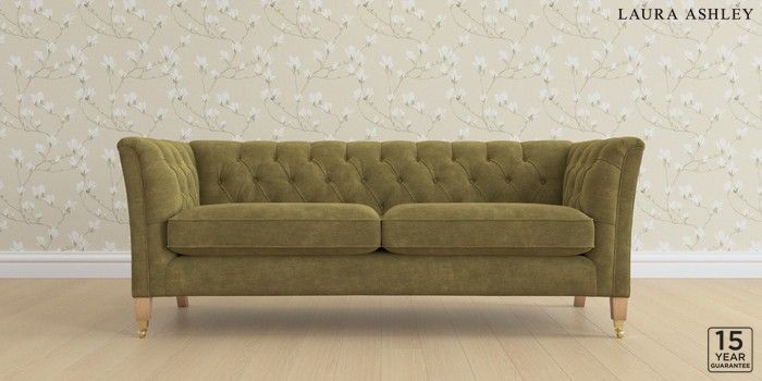6.12.1 Buy Chatsworth Button Back by Laura Ashley 3 Seater Sofa Alwyn Velvet Olive Green Straight Brass Castor - Light Oak from the Laura Ashley online shop Click here to use our website with more accessibility support, for example screen readers