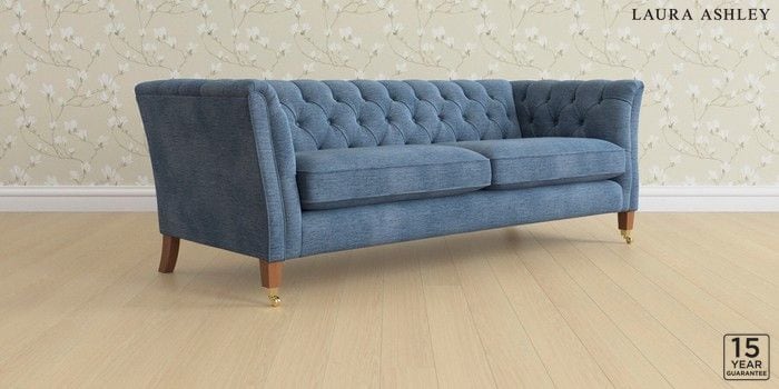 6.12.1 Buy Chatsworth Button Back by Laura Ashley 4 Seater Sofa Edwin Chenille Seaspray Blue Straight Brass Castor - Teak from the Laura Ashley online shop Click here to use our website with more accessibility support, for example screen readers