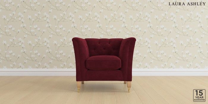 6.12.1 Buy Chatsworth Button Back by Laura Ashley Armchair Alwyn Velvet Burgundy Red Straight Brass Castor - Light Oak from the Laura Ashley online shop Click here to use our website with more accessibility support, for example screen readers