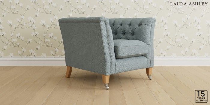 6.12.1 Buy Chatsworth Button Back by Laura Ashley Armchair Anneliese Seaspray Blue Straight Chrome Castor - Light Oak from the Laura Ashley online shop Click here to use our website with more accessibility support, for example screen readers