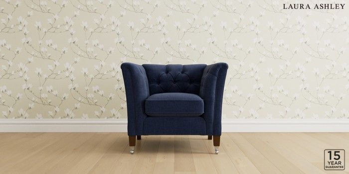6.12.1 Buy Chatsworth Button Back by Laura Ashley Armchair Nantmor Midnight Navy Straight Chrome Castor - Teak from the Laura Ashley online shop Click here to use our website with more accessibility support, for example screen readers