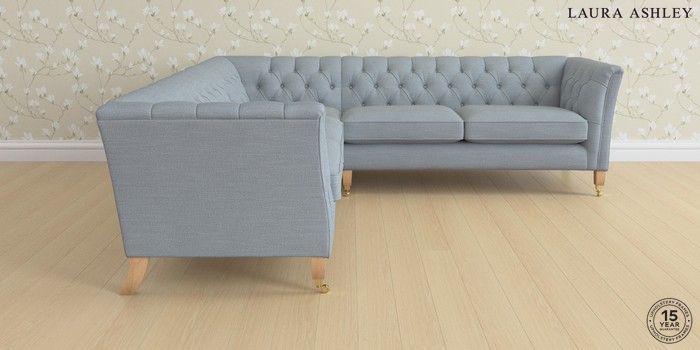 6.12.1 Buy Chatsworth Button Back by Laura Ashley Medium Corner Sofa - Universal Kinsham Seaspray Blue Straight Brass Castor - Light Oak from the Laura Ashley online shop Click here to use our website with more accessibility support, for example screen readers