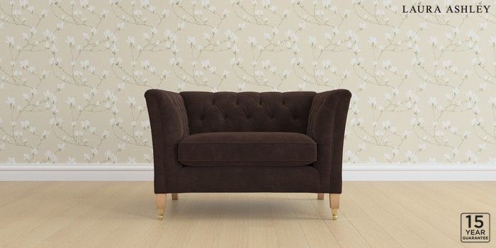 6.12.1 Buy Chatsworth Button Back by Laura Ashley Snuggle Alwyn Velvet Chocolate Brown Straight Brass Castor - Light Oak from the Laura Ashley online shop Click here to use our website with more accessibility support, for example screen readers