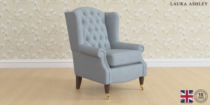 6.12.1 Buy Enderby Buttoned by Laura Ashley Armchair Kinsham Seaspray Blue Unique Brass Castor - Chestnut from the Laura Ashley online shop Click here to use our website with more accessibility support, for example screen readers