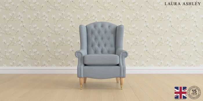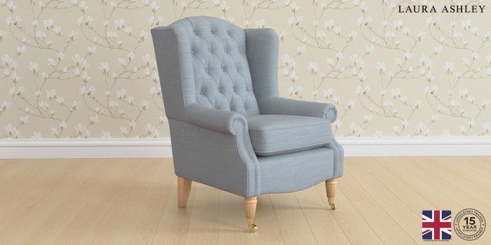 6.12.1 Buy Enderby Buttoned by Laura Ashley Armchair Kinsham Seaspray Blue Unique Brass Castor - Light Oak from the Laura Ashley online shop Click here to use our website with more accessibility support, for example screen readers