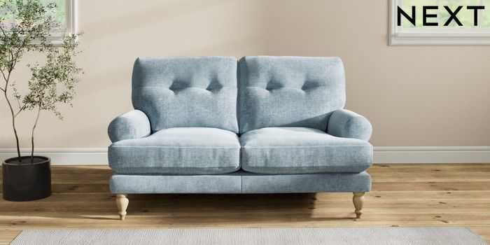 7.2.6 Buy Erin Buttoned Back Deep Relaxed Sit 2 Seater Small Sofa Plush Chenille Light Blue High Classic Turned - Light from the Laura Ashley online shop Click here to use our website with more accessibility support, for example screen readers
