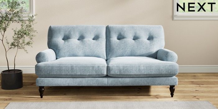 7.2.6 Buy Erin Buttoned Back Deep Relaxed Sit 3 Seater Small Sofa Plush Chenille Light Blue High Classic Turned - Dark from the Laura Ashley online shop Click here to use our website with more accessibility support, for example screen readers