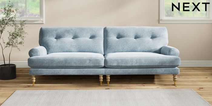 7.2.6 Buy Erin Buttoned Back Deep Relaxed Sit 4 Seater Large Sofa Plush Chenille Light Blue High Classic Turned Brass Castor - Light from the Laura Ashley online shop Click here to use our website with more accessibility support, for example screen readers