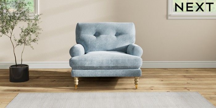 7.2.6 Buy Erin Buttoned Back Deep Relaxed Sit Armchair Plush Chenille Light Blue High Classic Turned Brass Castor - Light from the Laura Ashley online shop Click here to use our website with more accessibility support, for example screen readers