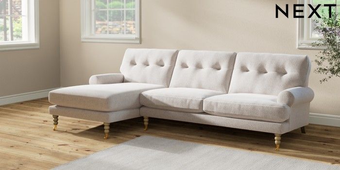 7.2.6 Buy Erin Buttoned Back Deep Relaxed Sit Medium Sofa Chaise - Left Hand Multi Weave Oyster High Classic Turned Brass Castor - Light from the Laura Ashley online shop Click here to use our website with more accessibility support, for example screen readers