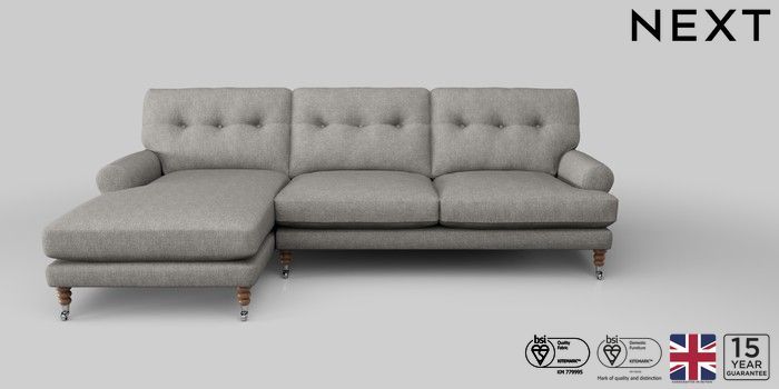 6.12.1 Buy Erin Buttoned Back Deep Relaxed Sit Medium Sofa Chaise - Left Hand Tweedy Chenille Mid Grey High Classic Turned Chrome Castor - Mid from the Laura Ashley online shop Click here to use our website with more accessibility support, for example screen readers