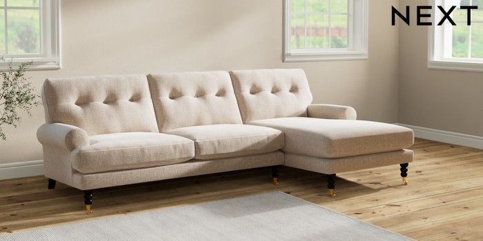 7.2.6 Buy Erin Buttoned Back Deep Relaxed Sit Medium Sofa Chaise - Right Hand Multi Weave Mid Natural High Classic Turned Brass Castor - Dark from the Laura Ashley online shop Click here to use our website with more accessibility support, for example screen readers