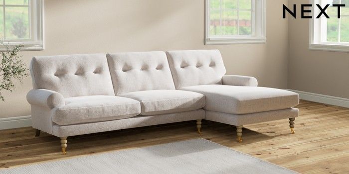 7.2.6 Buy Erin Buttoned Back Deep Relaxed Sit Medium Sofa Chaise - Right Hand Multi Weave Oyster High Classic Turned Brass Castor - Light from the Laura Ashley online shop Click here to use our website with more accessibility support, for example screen readers