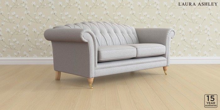 6.12.1 Buy Gloucester Button Back by Laura Ashley 3 Seater Small Sofa Wooton Pale Steel Grey Low Brass Castor - Light Oak from the Laura Ashley online shop Click here to use our website with more accessibility support, for example screen readers
