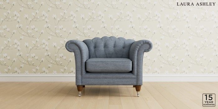 6.12.1 Buy Gloucester Button Back by Laura Ashley Armchair Harley Seaspray Blue Low Chrome Castor - Teak from the Laura Ashley online shop Click here to use our website with more accessibility support, for example screen readers