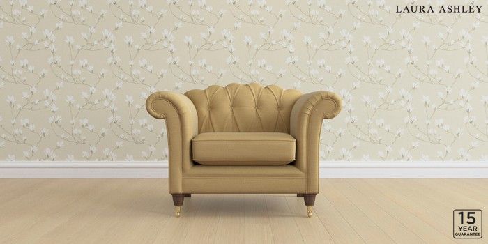 6.12.13 Buy Gloucester Button Back by Laura Ashley Armchair Kinsham Ochre Yellow Low Brass Castor - Chestnut from the Laura Ashley online shop Click here to use our website with more accessibility support, for example screen readers