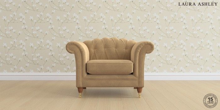6.12.1 Buy Gloucester Button Back by Laura Ashley Armchair Lundar Chenille Caramel Natural Low Brass Castor - Teak from the Laura Ashley online shop Click here to use our website with more accessibility support, for example screen readers