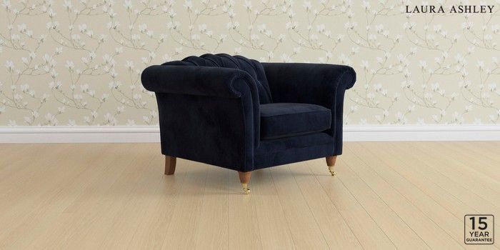 6.12.13 Buy Gloucester Button Back by Laura Ashley Armchair Orla Midnight Navy Low Brass Castor - Teak from the Laura Ashley online shop Click here to use our website with more accessibility support, for example screen readers