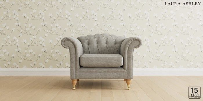6.12.13 Buy Gloucester Button Back by Laura Ashley Armchair Orla Pale Steel Grey Low Brass Castor - Light Oak from the Laura Ashley online shop Click here to use our website with more accessibility support, for example screen readers
