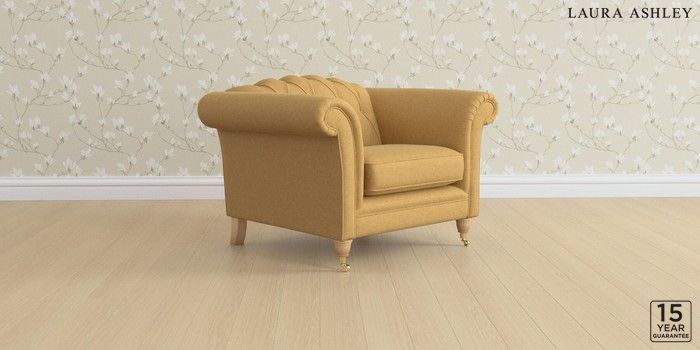 6.12.13 Buy Gloucester Button Back by Laura Ashley Armchair Peyton Ochre Yellow Low Brass Castor - Light Oak from the Laura Ashley online shop Click here to use our website with more accessibility support, for example screen readers