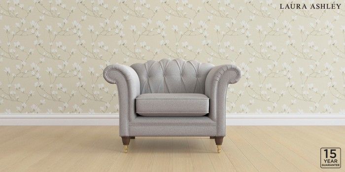 6.12.1 Buy Gloucester Button Back by Laura Ashley Armchair Wooton Pale Steel Grey Low Brass Castor - Chestnut from the Laura Ashley online shop Click here to use our website with more accessibility support, for example screen readers