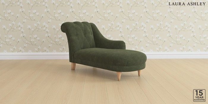 6.12.1 Buy Gloucester Button Back by Laura Ashley Chaise Longue Right Hand Alwyn Velvet Ivy Green Low Turned - Light Oak from the Laura Ashley online shop Click here to use our website with more accessibility support, for example screen readers