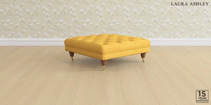 6.12.1 Buy Gloucester Button Back by Laura Ashley Extra Large Footstool Bainton Ochre Yellow Low Brass Castor - Teak from the Laura Ashley online shop Click here to use our website with more accessibility support, for example screen readers