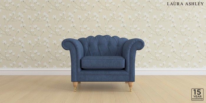 6.12.1 Buy Gloucester Button Back by Laura Ashley Armchair Bainton Midnight Navy Low Brass Castor - Light Oak from the Laura Ashley online shop Click here to use our website with more accessibility support, for example screen readers