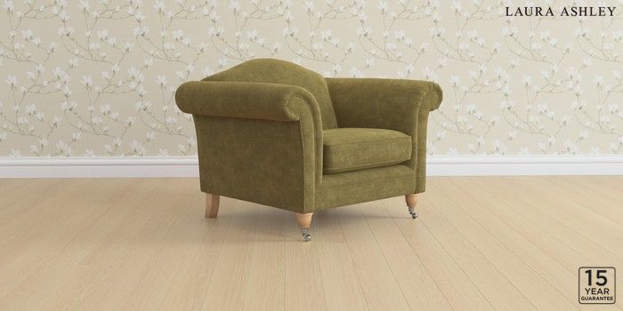 6.12.1 Buy Gloucester by Laura Ashley Armchair Alwyn Velvet Olive Green Low Chrome Castor - Light Oak from the Laura Ashley online shop Click here to use our website with more accessibility support, for example screen readers
