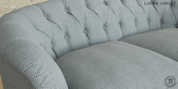 The Laura Ashley Hathersage is a signature deep sit curved sofa in the Chesterfield style. Featuring deep buttoned arms matching the height of the back of the sofa, combined with deep seat cushions filled with foam core and fibre wrap interiors, this sofa is perfect for relaxing in. A gently curved front seat profile and turned legs with brass or chrome castors complete this design.