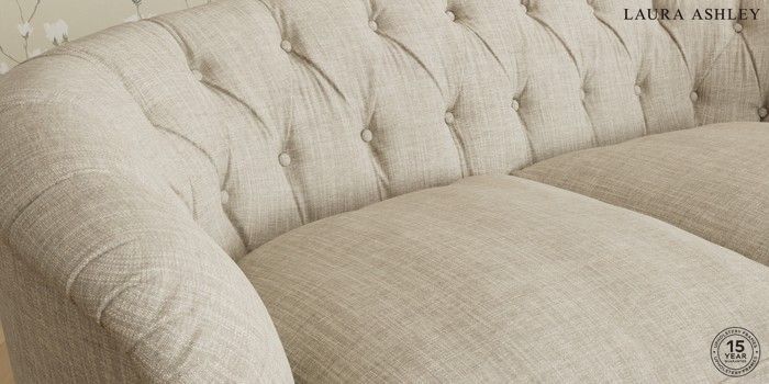 The Laura Ashley Hathersage is a signature deep sit curved sofa in the Chesterfield style. Featuring deep buttoned arms matching the height of the back of the sofa, combined with deep seat cushions filled with foam core and fibre wrap interiors, this sofa is perfect for relaxing in. A gently curved front seat profile and turned legs with brass or chrome castors complete this design.