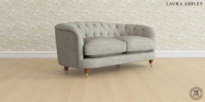 The Laura Ashley Hathersage is a signature deep sit curved sofa in the Chesterfield style. Featuring deep buttoned arms matching the height of the back of the sofa, combined with deep seat cushions filled with foam core and fibre wrap interiors, this sofa is perfect for relaxing in. A gently curved front seat profile and turned legs with brass or chrome castors complete this design.