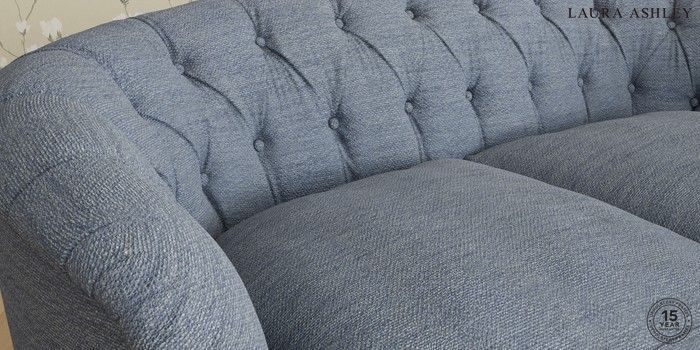 The Laura Ashley Hathersage is a signature deep sit curved sofa in the Chesterfield style. Featuring deep buttoned arms matching the height of the back of the sofa, combined with deep seat cushions filled with foam core and fibre wrap interiors, this sofa is perfect for relaxing in. A gently curved front seat profile and turned legs with brass or chrome castors complete this design.