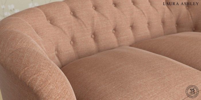 The Laura Ashley Hathersage is a signature deep sit curved sofa in the Chesterfield style. Featuring deep buttoned arms matching the height of the back of the sofa, combined with deep seat cushions filled with foam core and fibre wrap interiors, this sofa is perfect for relaxing in. A gently curved front seat profile and turned legs with brass or chrome castors complete this design.